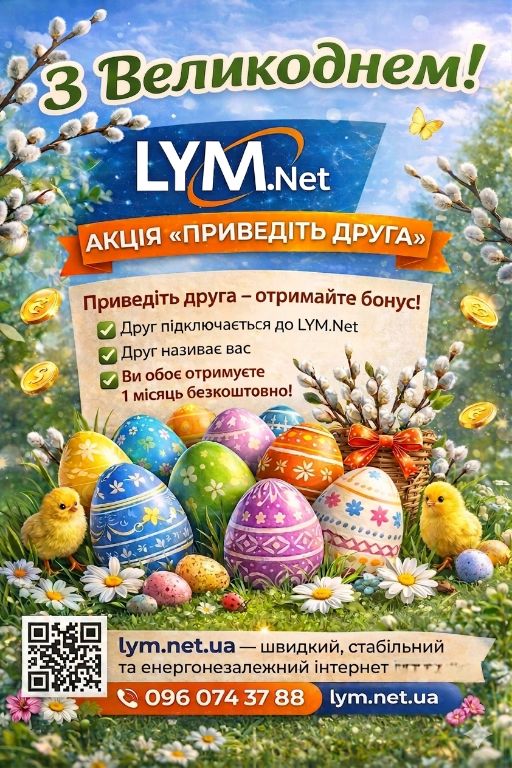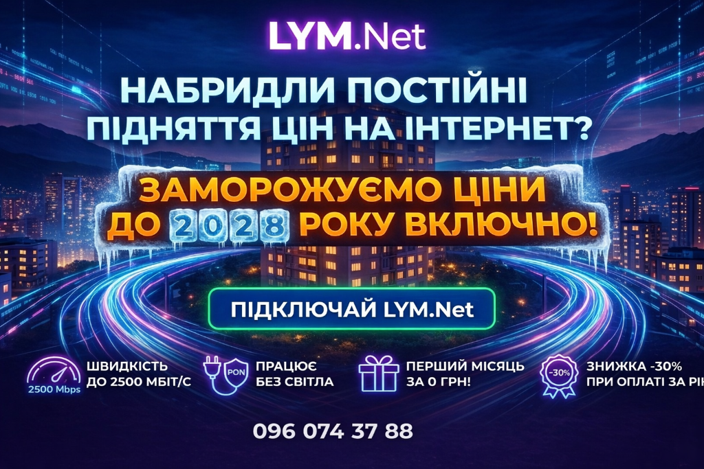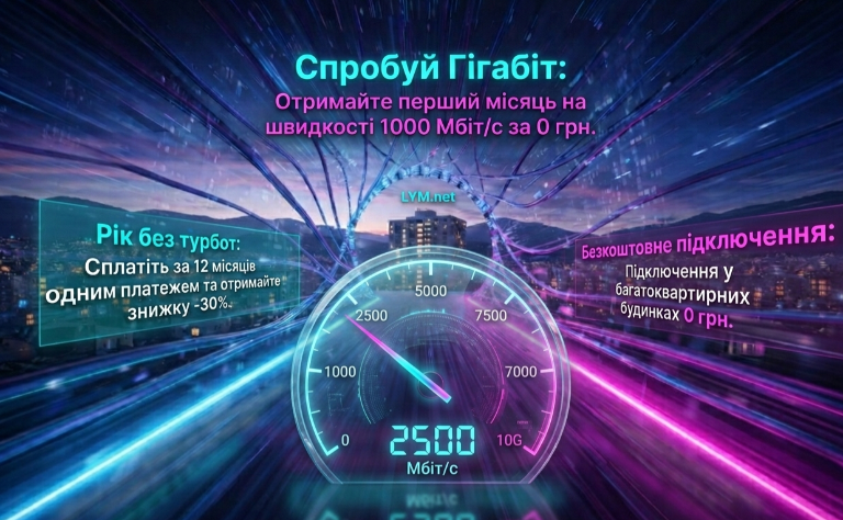 Умови: Кожен новий абонент отримує перший місяць користування інтернетом на швидкості 1000 Мбіт/с безкоштовно.